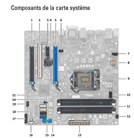 Image de la carte-mère Optiplex 7010. Source : Dell OptiPlex 9010/7010 Mini-tour Manuel du propriétaire, page 35