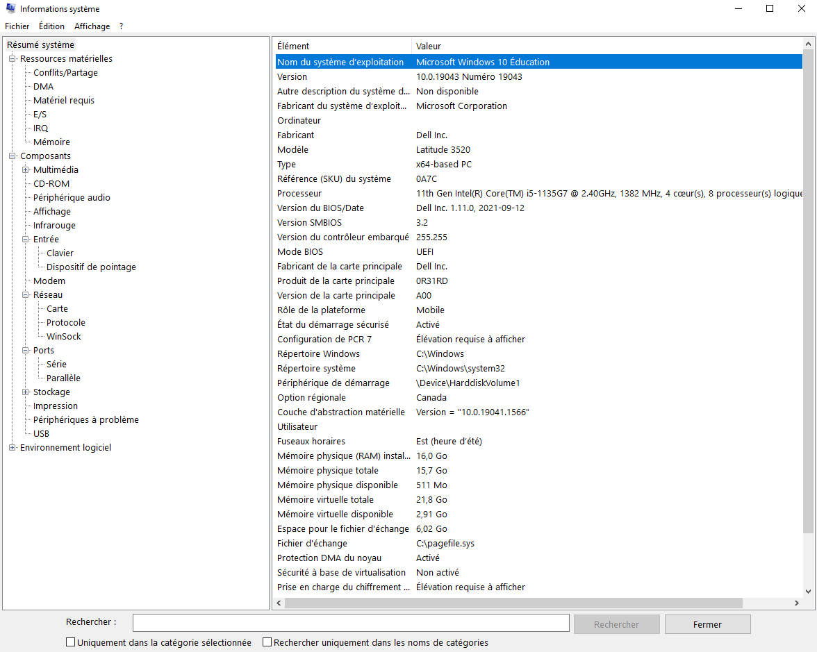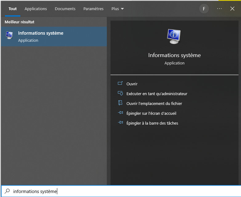 Dans le menu démarrer, inscrivez informations système. Le chemin de l'exécutable du logiciel se retrouve : %windir%\system32\msinfo32.exe