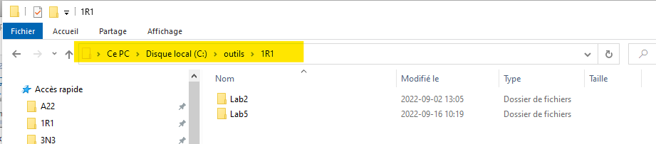 Dans l'exemple ci-dessous, le dossier de travail est C:\outils\1R1