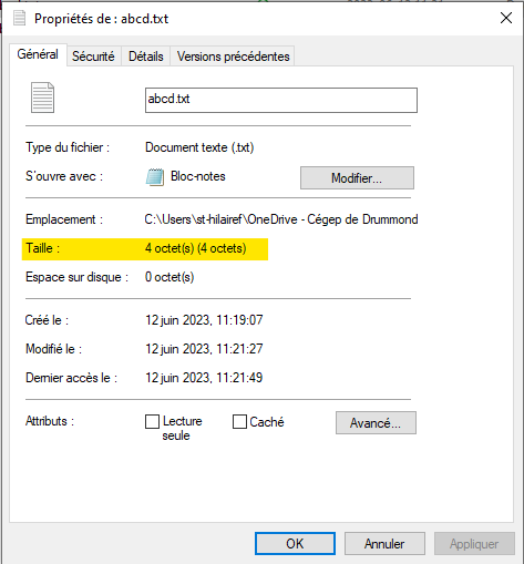 Voici un fichier texte qui contient uniquement abcd. Sa taille sera de 4 octets.