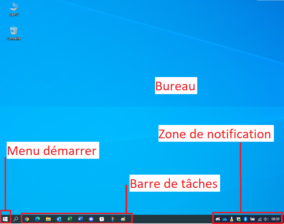 La barre de tâches contient plusieurs éléments. Il est possible de modifier l'emplacement de la barre de tâche, mais sous Windows, le standard est en bas.