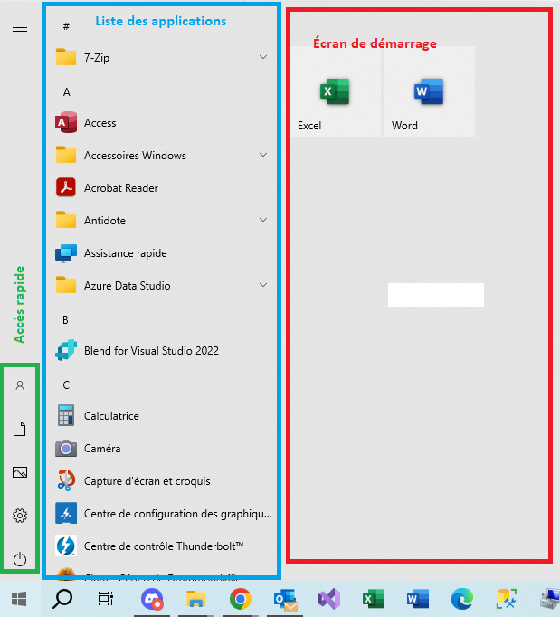 Le men Démarrer est le point de départ pour accéder aux logiciels de l'ordinateur, aux paramètres de configuration, aux fonctionnalités de Windows, au changement d'utilisateur et à la fermeture de l'ordinateur.