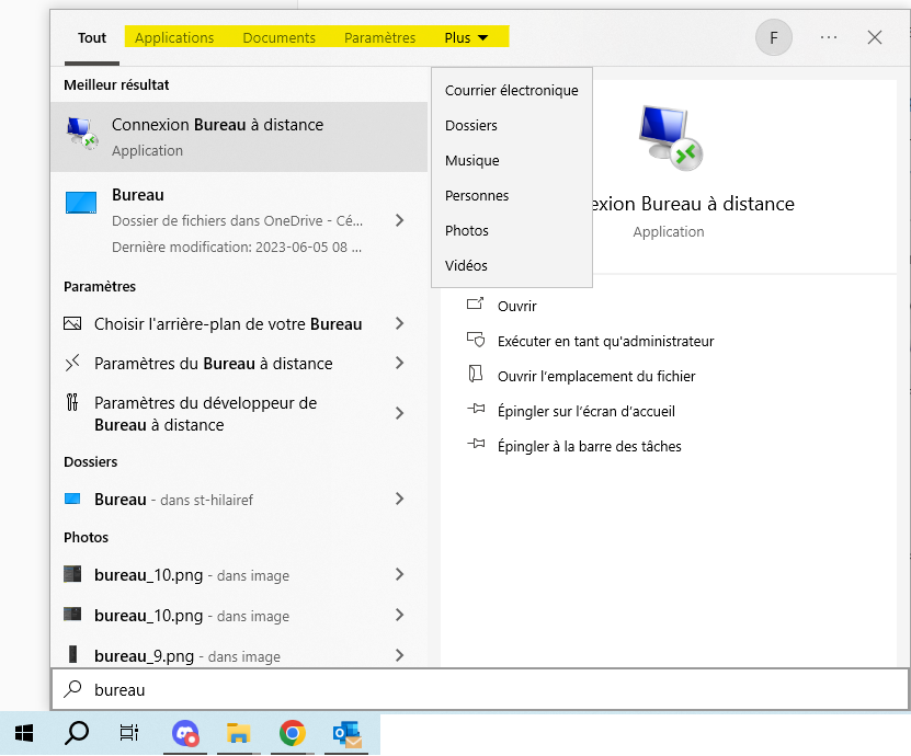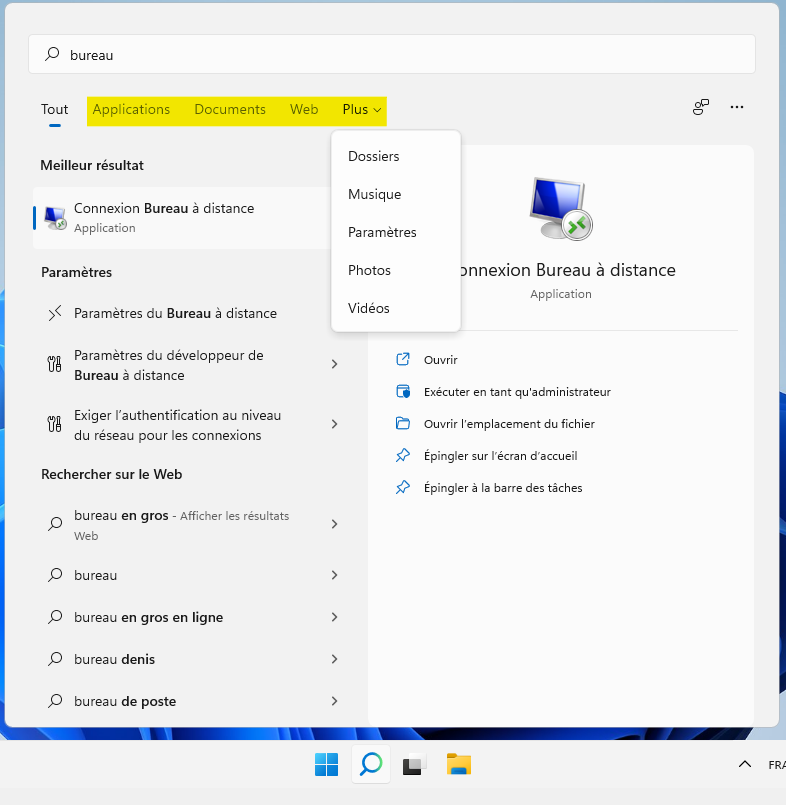 Par défaut, Windows cherchera dans les programmes, dans les documents, les paramètres...