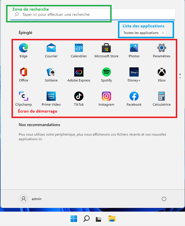Voici la représentation des différentes sections de l'interface graphique pour Windows 11.